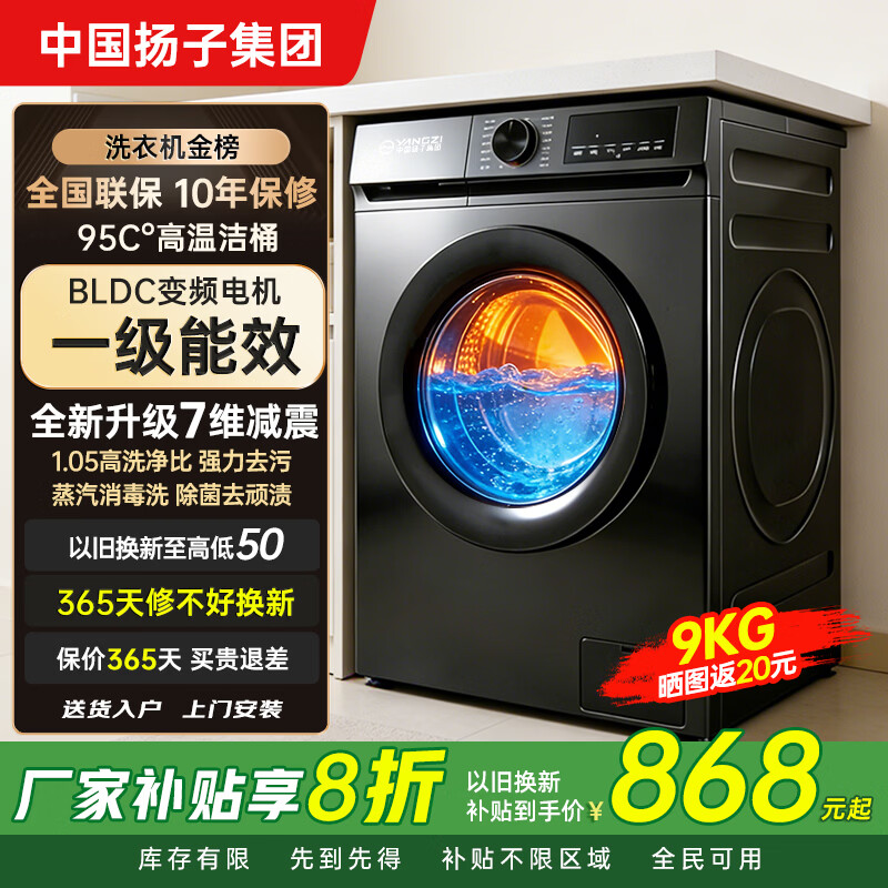 扬子集团【补贴20%】10公斤洗脱一体滚筒洗衣机超薄全自动节能家用大容量洗衣机 9kg高温+蓝光 上门安装 一级变频 洗净比1.05 滚筒