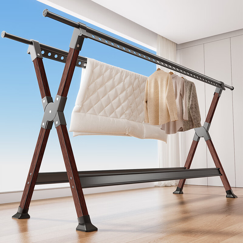 四季沐歌折叠晾衣架落地凉晒衣架铝合金家用晒被子阳台晾衣架晒衣架挂衣架 【胡桃风晒网款】铝合金可伸缩2.5m