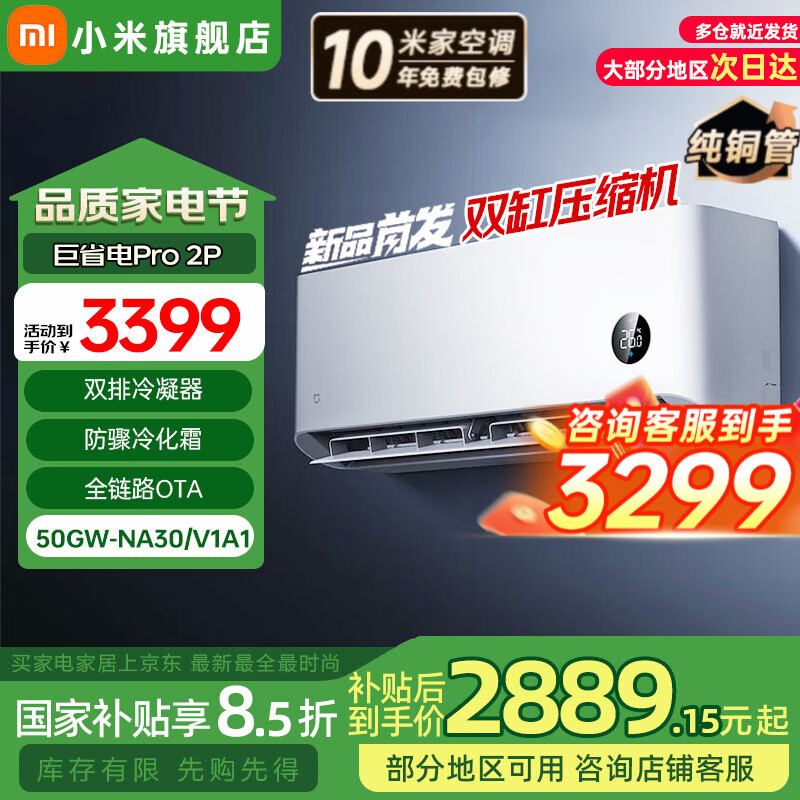 小米(MI)米家新款1.5匹巨省电 双排款 健康风 变频冷暖智能互联自清洁一级能效壁挂式卧室客厅家用空调挂机 2匹 超一级能效 25款巨省电Pro【 双缸压缩机 】
