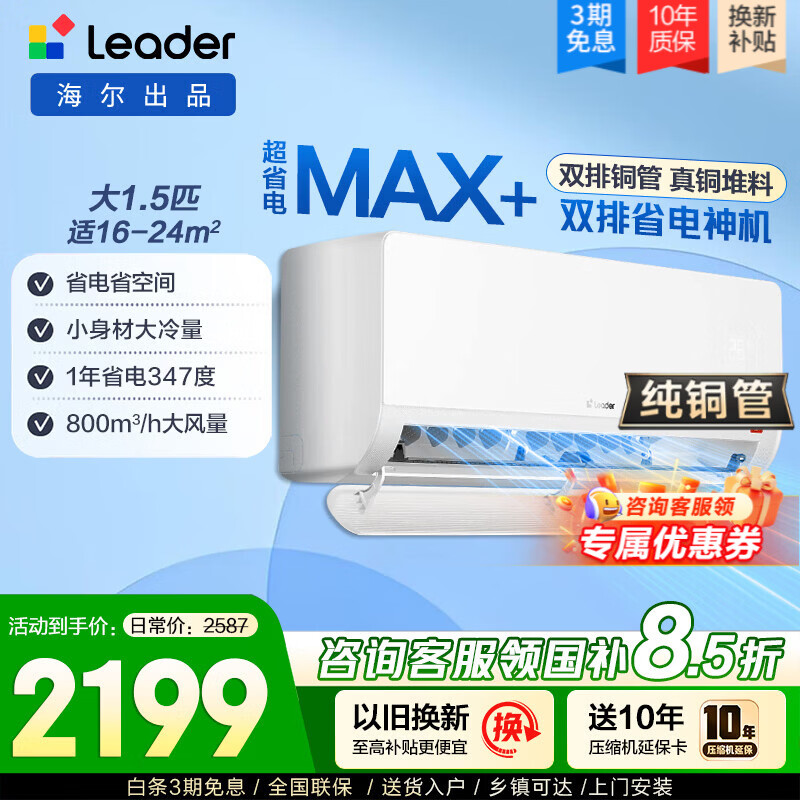 海尔空调出品统帅新1级纯铜管超省电大1.5匹AI智能挂机空调 大风量防直吹卧室冷暖两用空调 以旧换新 【新品大双排铜管】超省电Max+|省电省空间