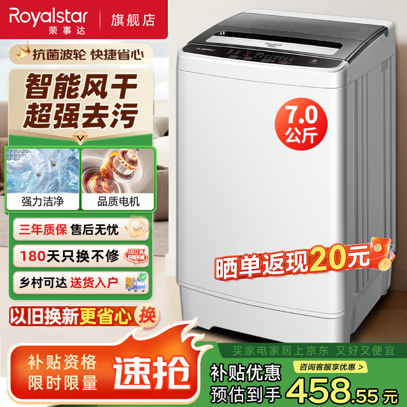荣事达(Royalstar)8公斤全自动洗衣机大容量波轮家用租房节能省电一键脱水 7.0KG家用洗护【智能风干 高效电机】 波轮