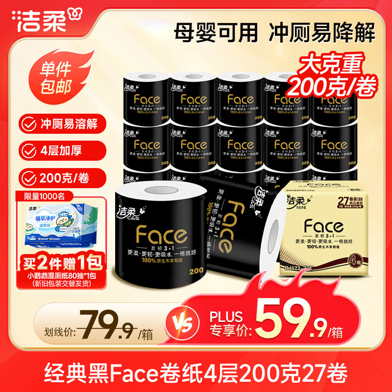 洁柔有芯卷纸 黑Face加厚4层200克*27卷 高克重 卫生纸卷筒纸纸巾整箱