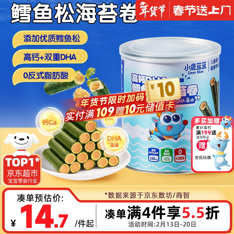 小鹿蓝蓝 高钙DHA鳕鱼松海苔卷鳕鱼味 宝宝零食鲜脆海苔鳕鱼肉松卷108g