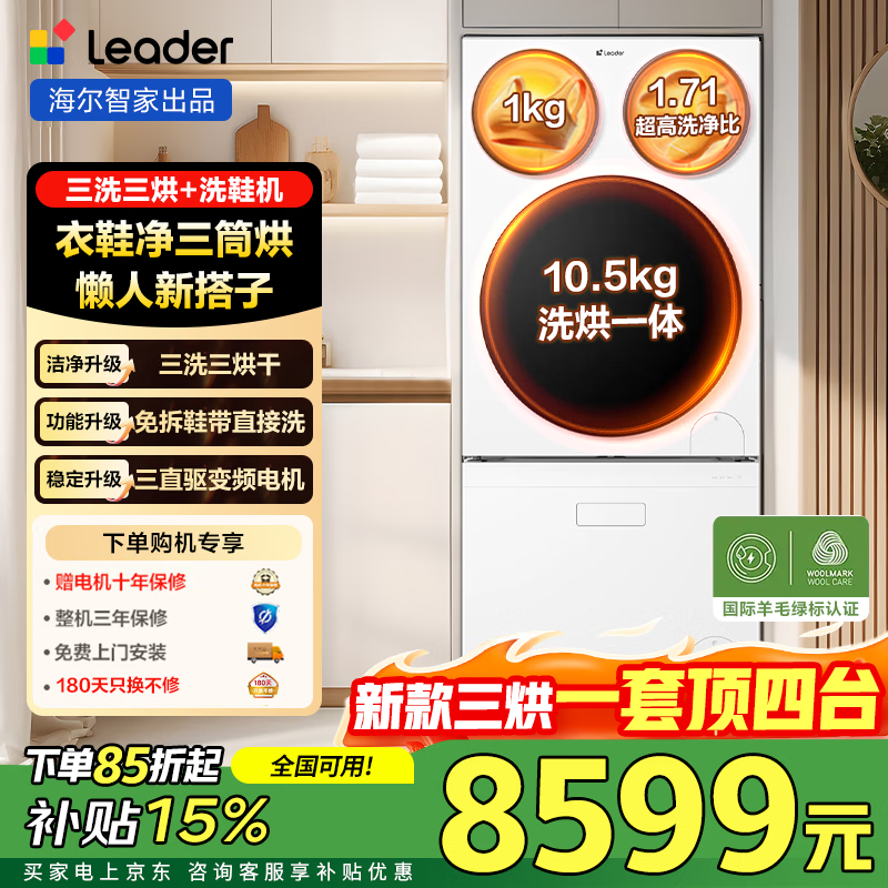 Leader海尔智家懒人三筒三烘洗衣机pro【新品商场同款三烘版】滚筒洗烘一体三烘版组合分区烘干衣机套装 新品标尺【 三筒 三烘+洗鞋机套装】衣鞋同净