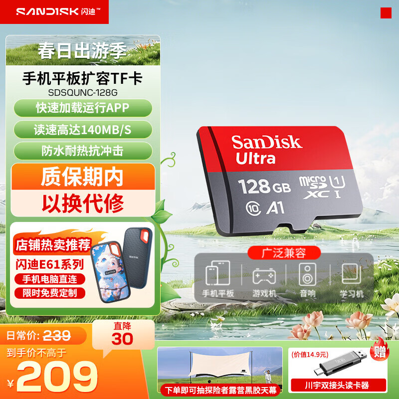闪迪(SanDisk)TF卡 监控内存卡行车记录仪存储卡手机内存MicroSD卡 至尊高速 128G+川宇双接头读卡器套装