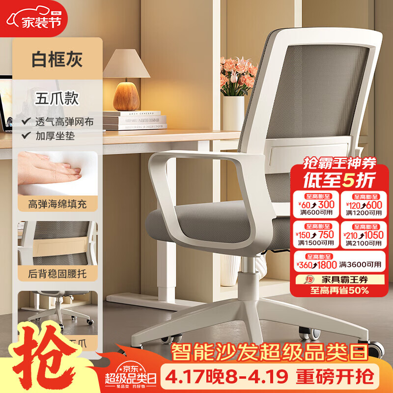 树浩电脑椅办公椅子舒适久坐靠背椅宿舍卧室学习座椅弓形电竞椅写字椅 【滑轮】海绵+尼龙脚-白框灰网