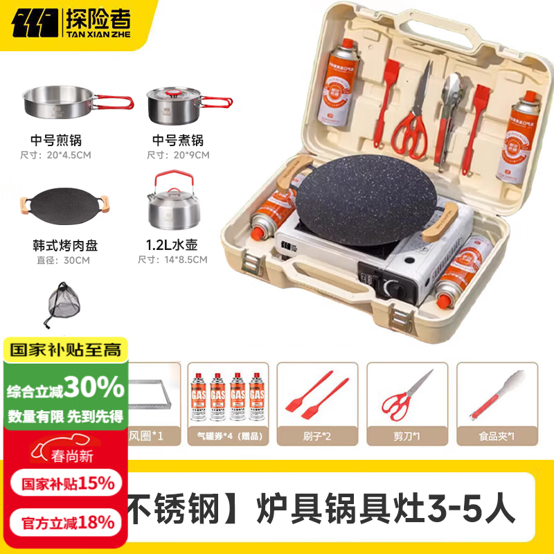 探险者卡式炉户外卡式炉具套装防爆卡磁炉全套带锅烤盘露营野餐烧烤卡斯 【304不锈钢】炉具锅具灶3-5人