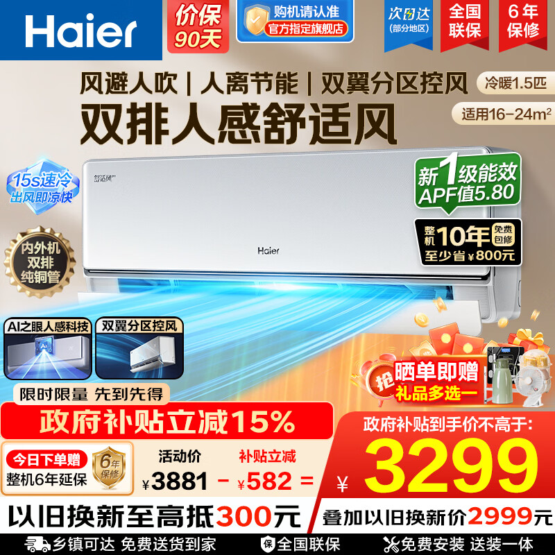 海尔(Haier)【国家补贴】空调挂机大1匹/1.5匹小红花净省电一级能效双排铜管蒸发器变频冷暖壁挂式 以旧换新 【舒适风】1.5匹丨双翼导风丨双排纯铜管