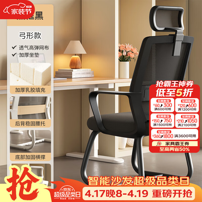 树浩电脑椅办公椅子舒适久坐靠背椅宿舍卧室学习座椅弓形电竞椅写字椅 【弓形头枕款】乳胶款-黑框黑网