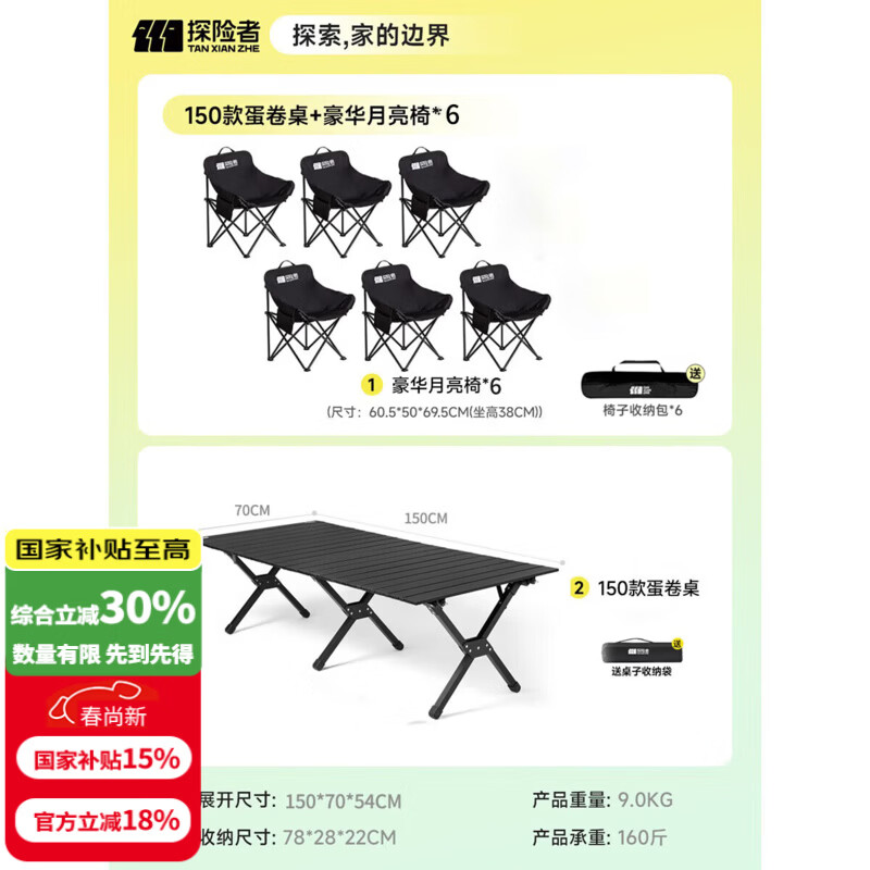 探险者(TAN XIAN ZHE)户外蛋卷桌折叠桌便携式桌椅套装露营桌子一套野餐桌装备全套摆摊 150黑色蛋卷桌+6黑色月亮椅