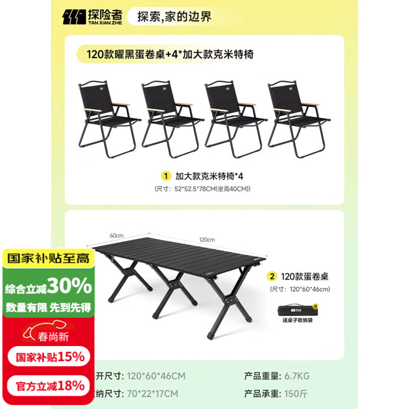 探险者(TAN XIAN ZHE)户外蛋卷桌折叠桌便携式桌椅套装露营桌子一套野餐桌装备全套摆摊 120黑色蛋卷桌+4加大黑色克米特椅