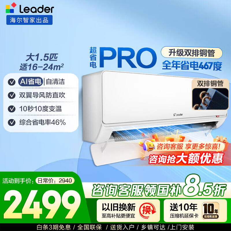 海尔空调出品统帅空调1.5匹新一级能效变频空调挂机 超省电空调 变频冷暖自清洁壁挂式 超省电pro 1.5匹 一级能效 省电双排神机