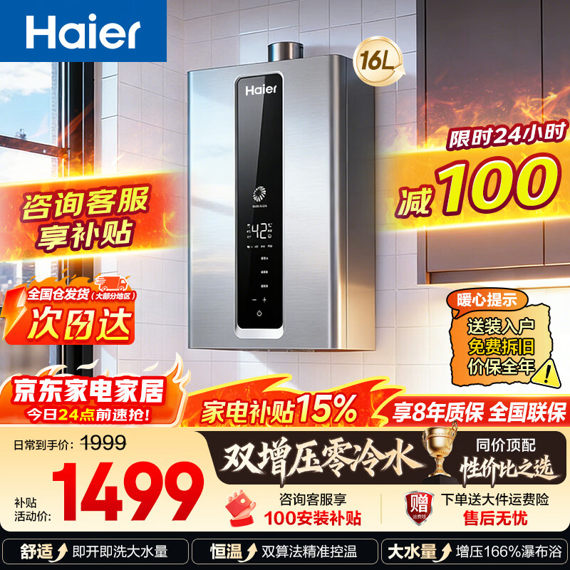 海尔(Haier)零冷水燃气热水器补贴16升水伺服双增压大水量家用速热恒温低噪音强排式 新品HD7 节能密闭舱 16L 延迟发货