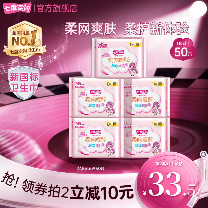 七度空间卫生巾姨妈巾少女超薄纯棉超长夜用卫生巾护垫批发 网面245mm*50片