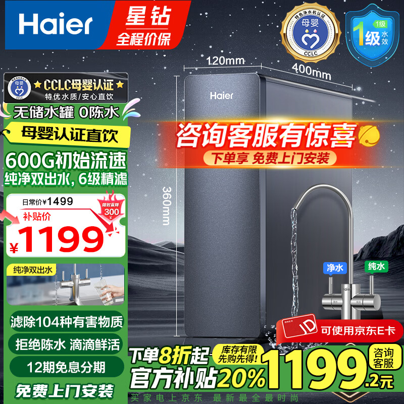 海尔净水器母婴认证家用厨下式RO反渗透纯水机管线机即热式直饮加热一体机餐边柜自来水过滤器套装 【星钻系列】母婴直饮净水器
