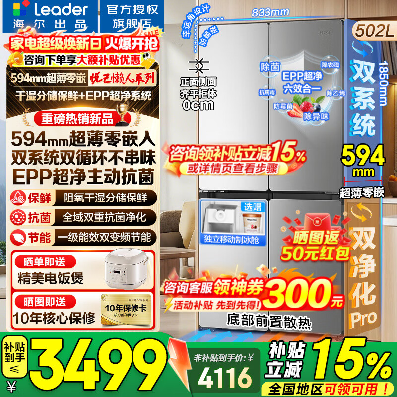 海尔冰箱出品零嵌入式四开门十字对开门风冷无霜超薄一级能效双变频节能大容量电冰箱国家补贴 502升双系统+594mm超薄零嵌+全域双重净化