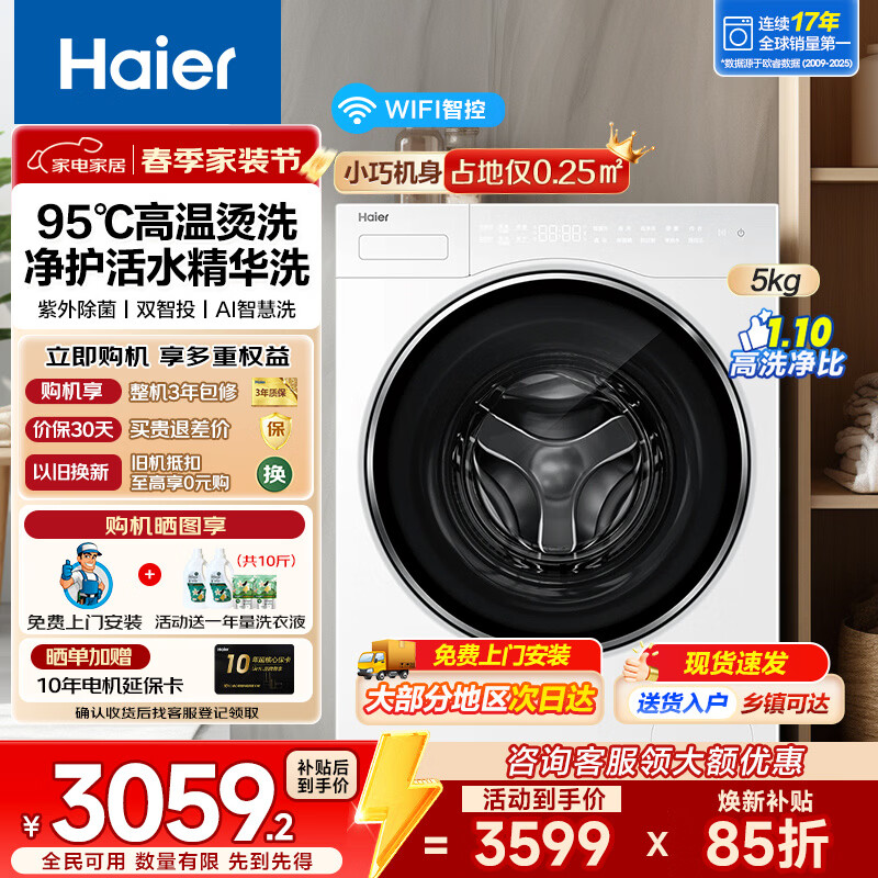 海尔滚筒洗衣机5公斤小型家用全自动婴儿儿童洗衣机特渍洗95℃高烫洗除菌螨超薄变频迷你滚筒洗衣机 升级款丨活水精华洗+紫外除菌+双智投+智联 滚筒单洗