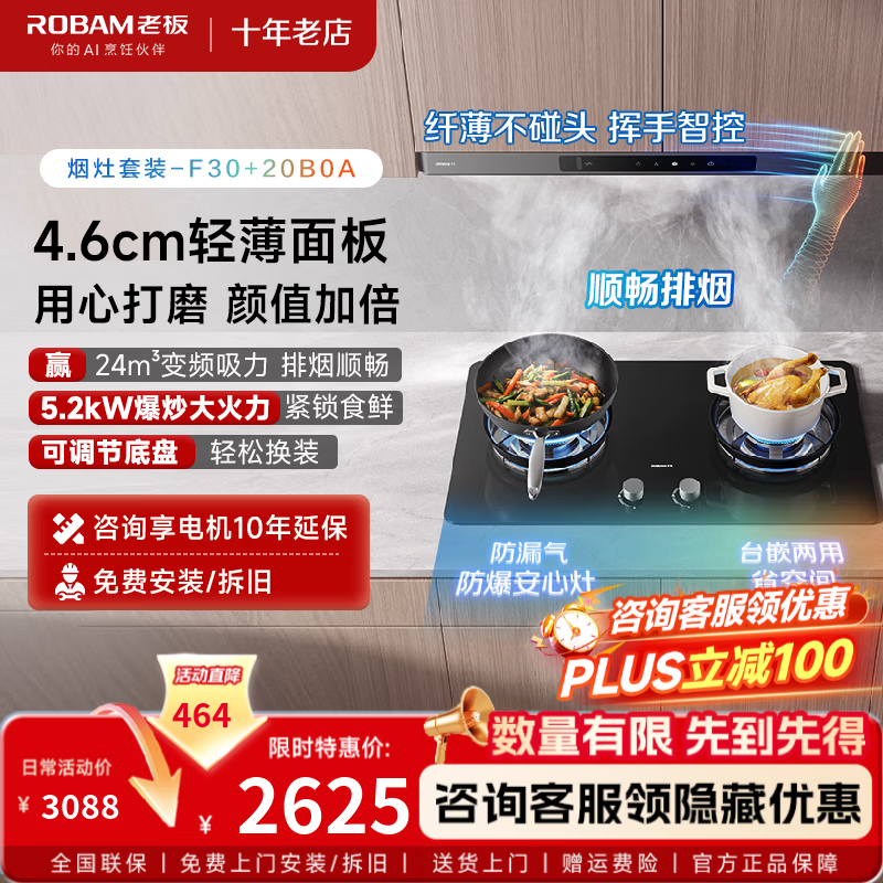 老板(Robam)【升级环吸大云板】F30油烟机灶具节能烟灶套装 厨房顶吸欧式24大风量 变频电机家用1050Pa大吸力 【入门款套装】烟机F30+星辰灶20B0A