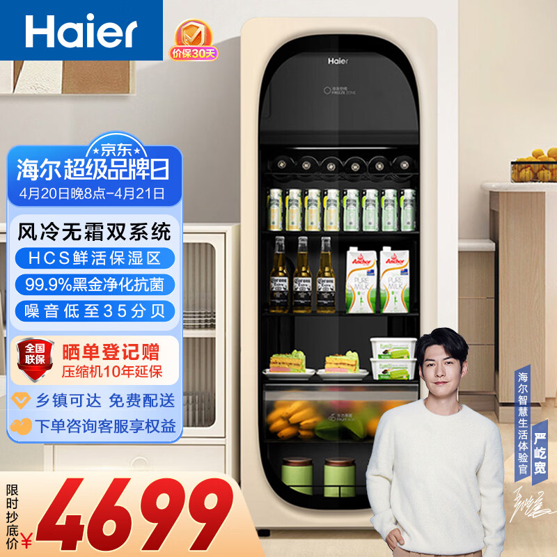 海尔(Haier)冰吧家用小型迷你冰箱客厅办公室卧室单门饮料茶叶水果红酒冷藏保鲜展示柜透明玻璃门超薄立式冰柜 双温区元气冰吧丨无霜冷冻室可制冰丨象牙米 229升