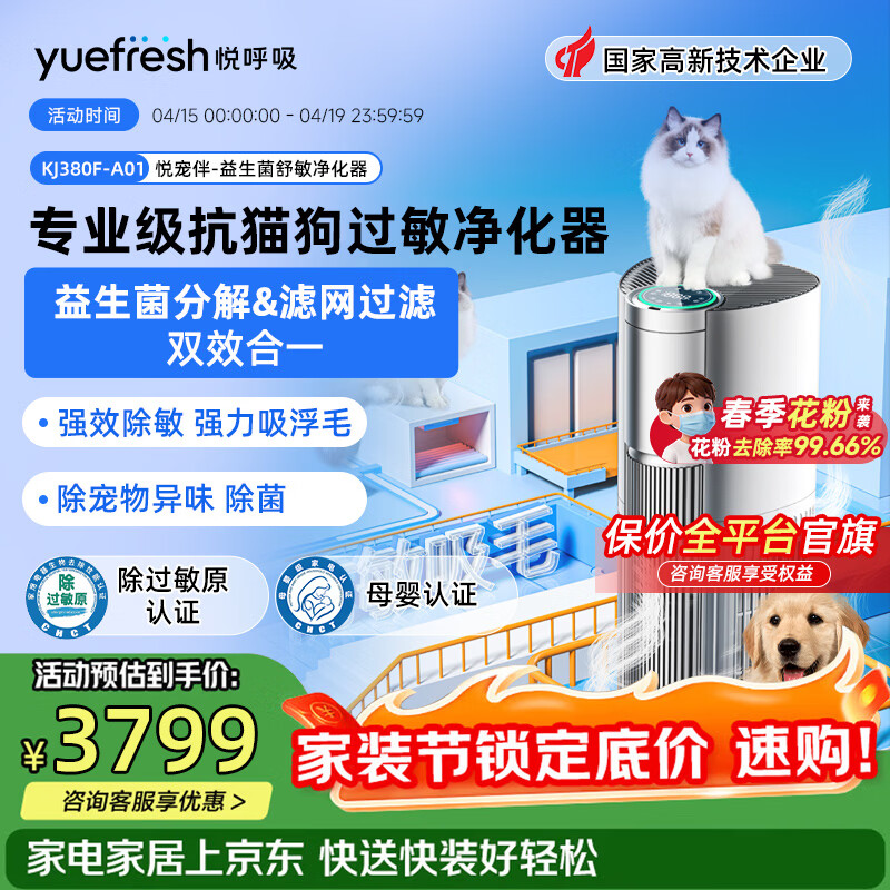悦呼吸yuefresh宠物空气净化器家用益生菌除过敏原猫狗用吸猫狗毛浮毛除臭除菌除甲醛尘螨异味舒敏净化机 米白色(配多效除敏菌盒)