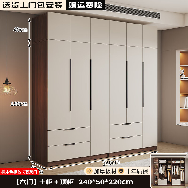 陌隆福衣柜卧室家用出租房用组装简易储物柜小户型简约现代衣橱 【六门】2.4米主柜+顶柜
