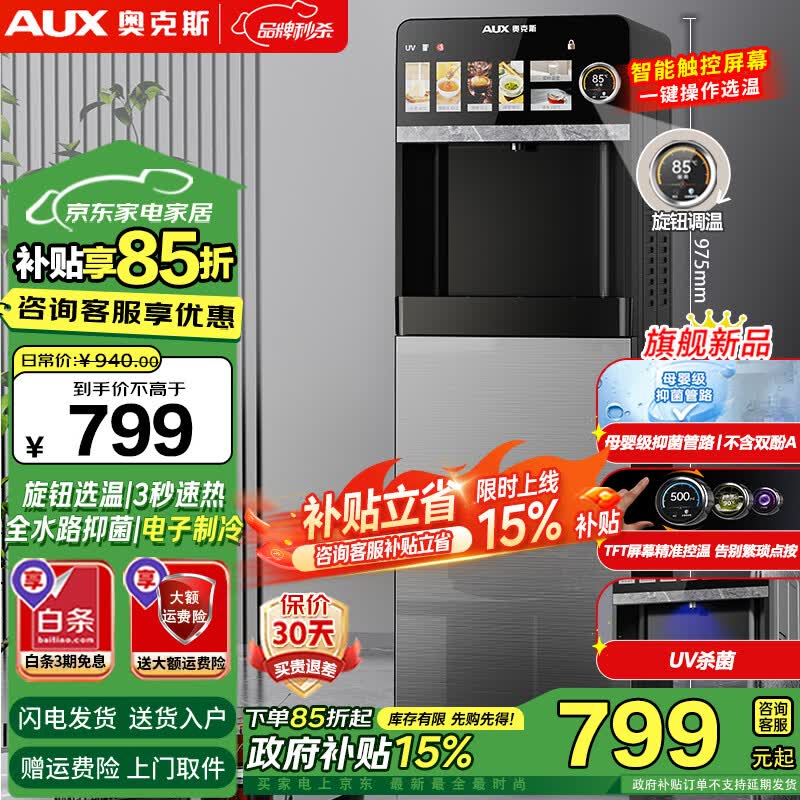 奥克斯(AUX) 饮水机下置式家用立式温热型快速加热下置水桶饮水器 3秒速热【旋钮选温】抑菌管路 即热制冷型