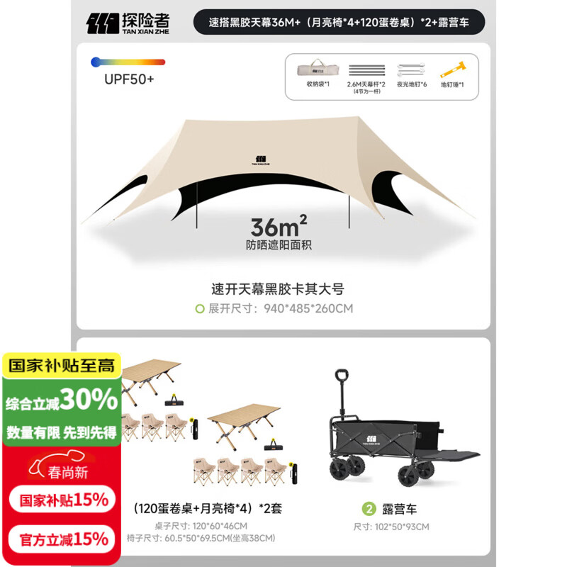 探险者(TAN XIAN ZHE)天幕帐篷户外露营车载便携六角防晒速开懒人天幕野营遮光遮阳棚 【舒适出行】36㎡天幕+月亮椅套装+推车