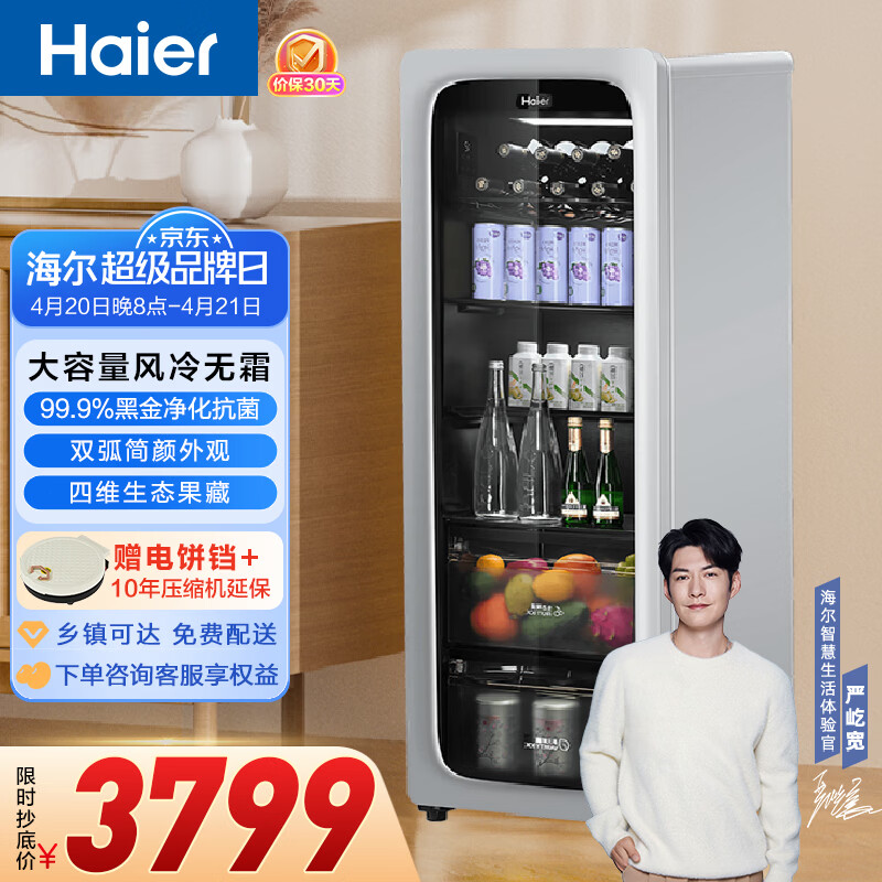 海尔(Haier)冰吧家用小型迷你冰箱客厅办公室卧室单门饮料茶叶水果红酒冷藏保鲜展示柜透明玻璃门超薄立式冰柜 全冷藏元气吧丨风冷无霜丨冰河银 200升