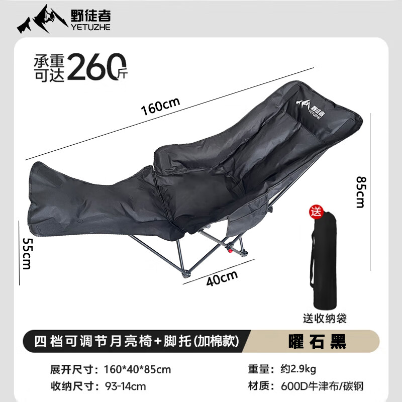 野徒者户外折叠椅露营椅子躺椅便携折叠月亮椅小凳子折叠凳钓鱼凳 曜石黑【四档+脚托】加棉款 可躺/睡觉