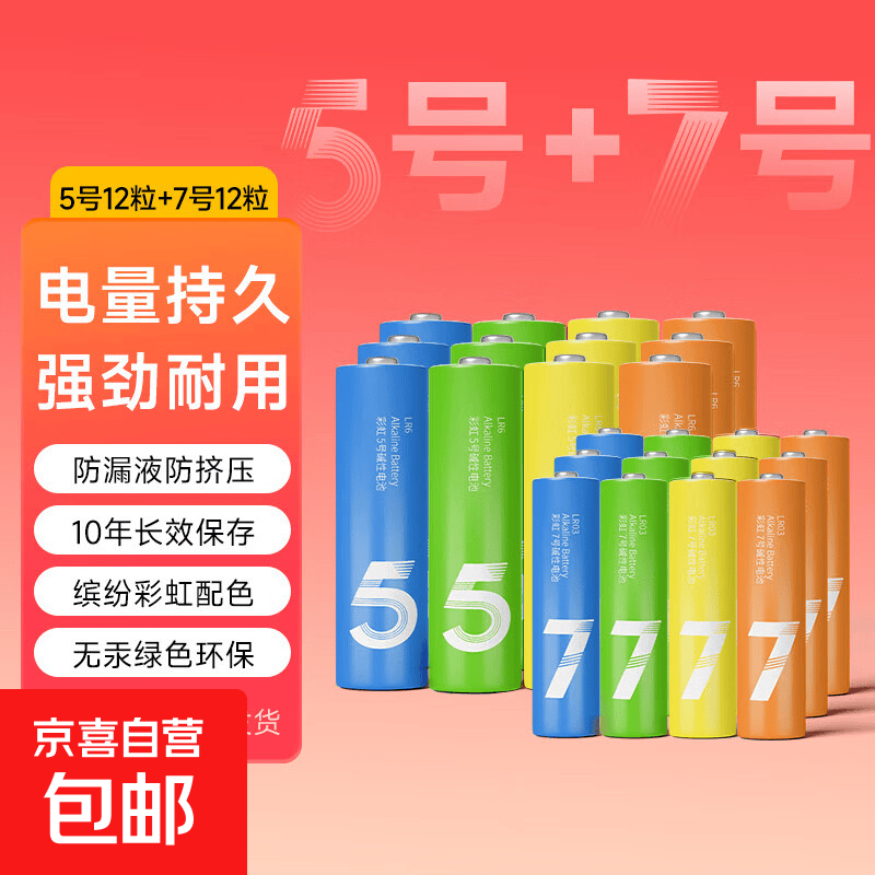 【小米同款色彩】高能彩虹碳性电池5号电池钟表玩具计算器电池7号电池空调遥控器鼠标/颜色随机 高能彩虹碱性【5号12粒+7号12粒】放电更持久