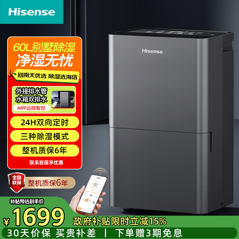 海信(Hisense)除湿机/抽湿机大面积家用除湿器轻音防霉抽湿器别墅吸湿器地下室去湿防潮干燥机 60L/天 120-180㎡ 适用别墅除湿WFI