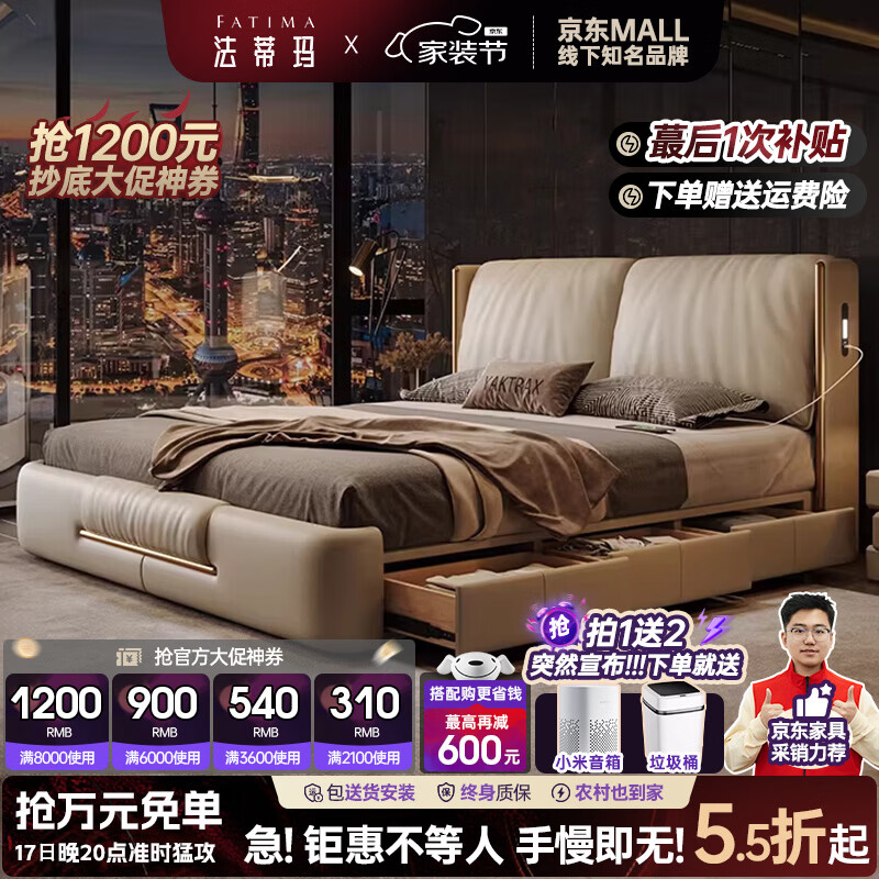 法蒂玛2026年新款真皮床双人现代主卧大床大象耳朵轻奢软包靠背储物婚床 床+七星泰国乳胶床垫+床头柜*2 1.8*2米框架结构