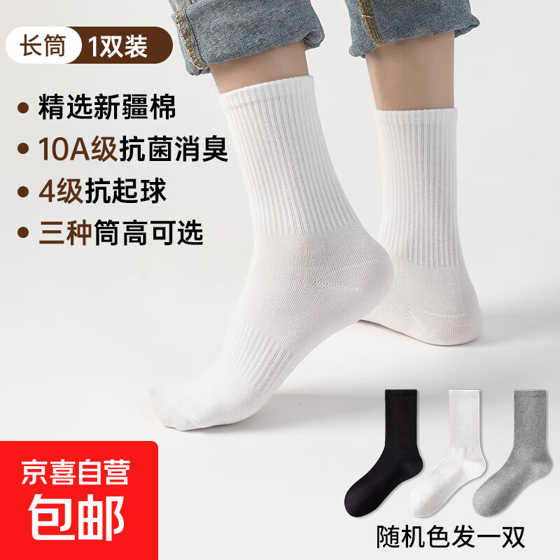 【10A抗菌】精梳棉抗起球袜子男防臭透气吸汗秋冬棉袜纯色中筒袜 【1双】随机颜色 长筒
