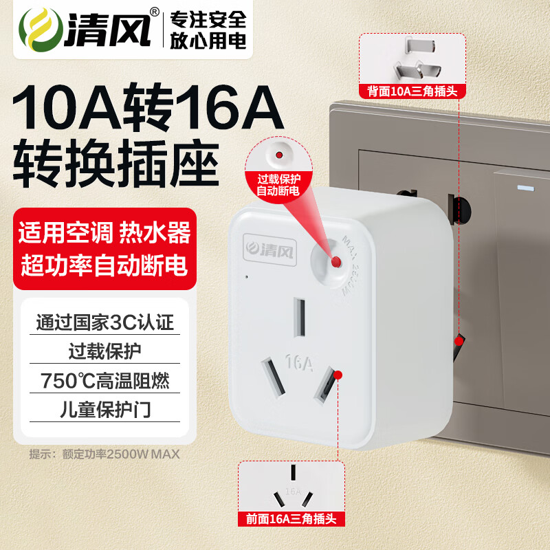 清风(kyfen)插座10a/16a空调伴侣电源转换器无线家用五孔大功率漏电保护 16A转16A 漏电保护 大功率