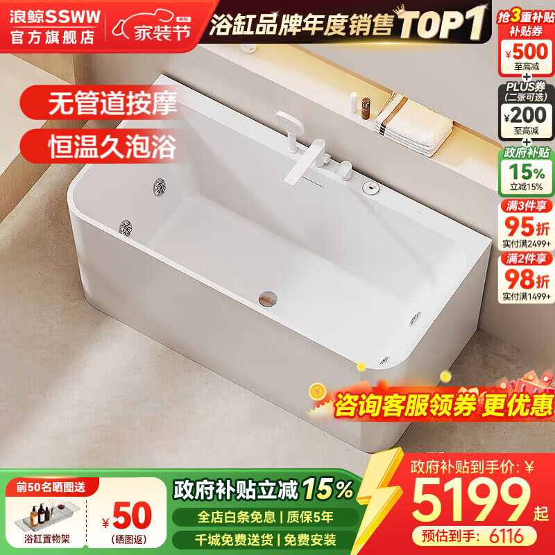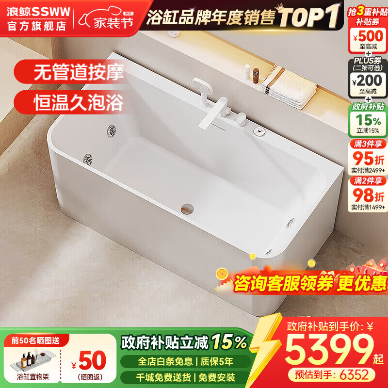 浪鲸(SSWW) 卫浴家用成人亚克力方形浴缸无缝一体泡澡浴缸含下水器0220鲸沐 【1.5m无管道按摩缸】