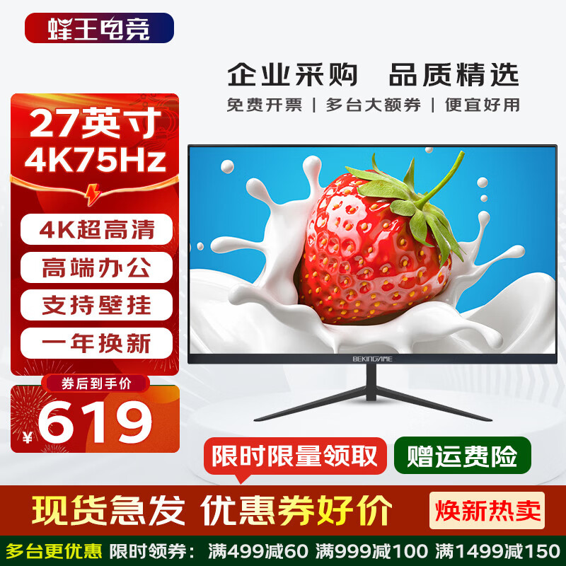 蜂王电竞显示器电脑屏幕主机办公显示屏 高刷电竞游戏屏 高清HDMI笔记本外接副屏设计影视娱乐家用壁挂监控 【4K大屏】27英寸4K75Hz黑色直面屏