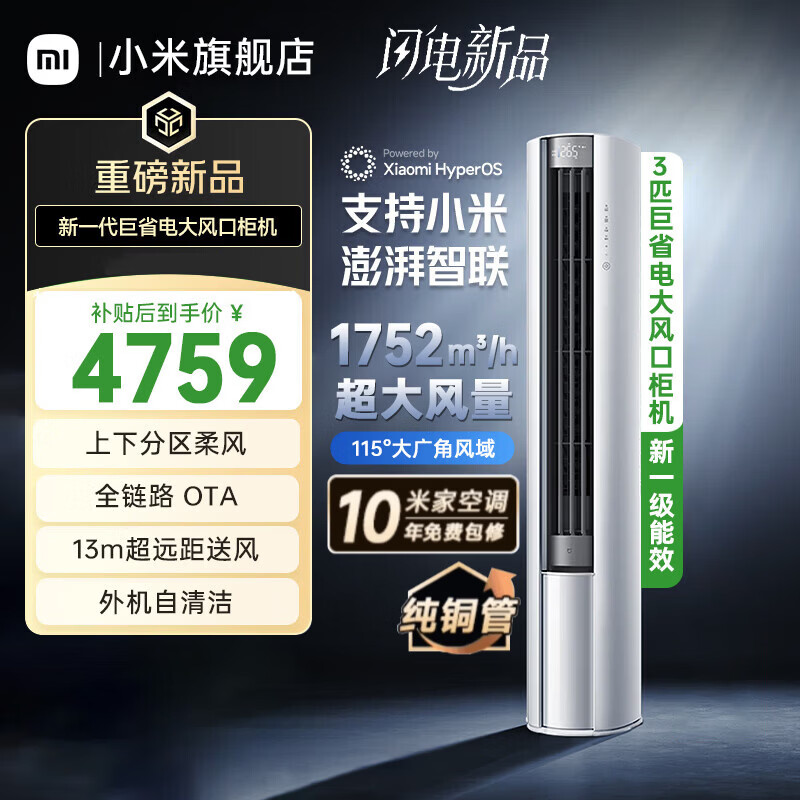 小米(MI)空调米家2匹/3匹巨省电Pro 立式柜机 大风口柔风新风自然风快速制冷暖变频家用低噪智能互联自清洁 3匹 一级能效 巨省电大风口【强劲大风量】