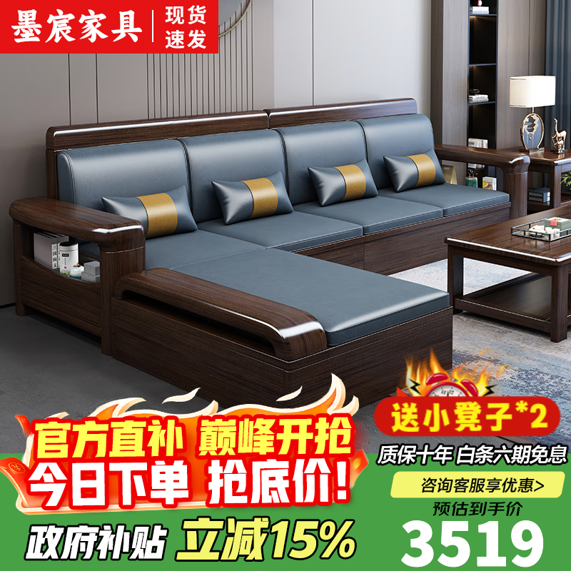 墨宸沙发 实木沙发新中式紫金檀木贵妃转角组合冬夏两用储物客厅家具 1+1+3+长茶几 定制 【免费升级】科技布坐垫