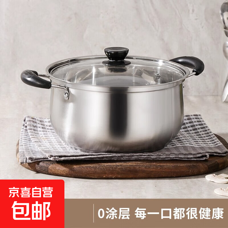 汤锅不锈钢家用蒸锅超厚蒸煮锅煮面泡面锅燃气电磁炉通用 银色双柄带盖 20cm