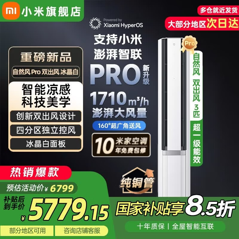 小米(MI)空调米家2匹/3匹巨省电Pro 立式柜机 大风口柔风新风自然风快速制冷暖变频家用低噪智能互联自清洁 3匹 一级能效 双出风自然风Pro冰晶白【超大风量】