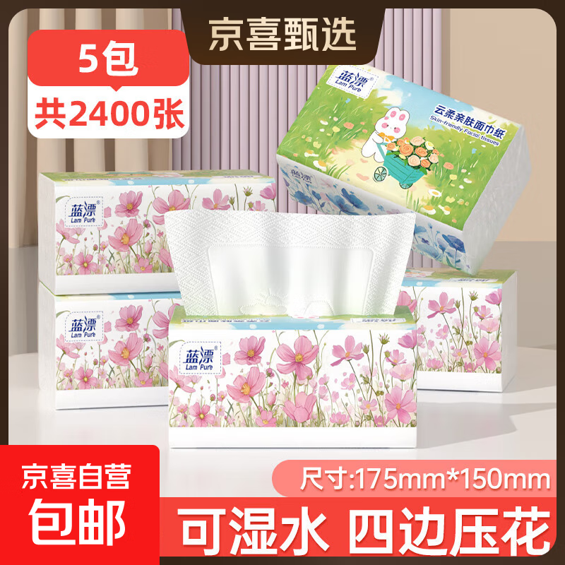 蓝漂纸巾抽纸面巾纸 原生木浆 超大包96抽5层加厚 4边压花 5层 480张*5包