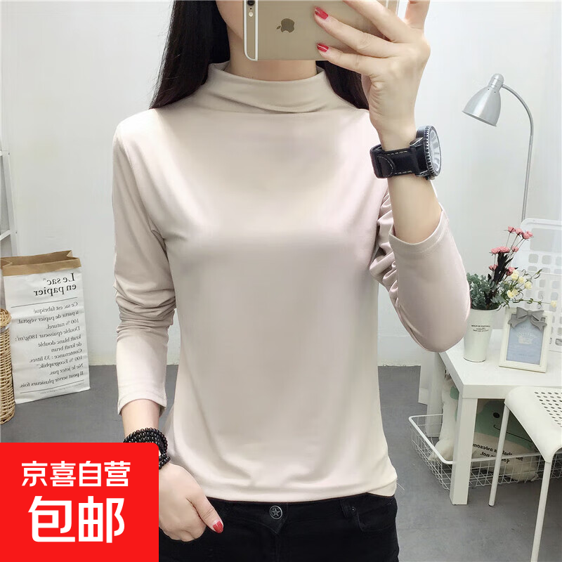 秋季小高领打底衫女内搭新款体恤长袖t恤打底百搭上衣半高领8003 卡其色 M 参考80-100斤