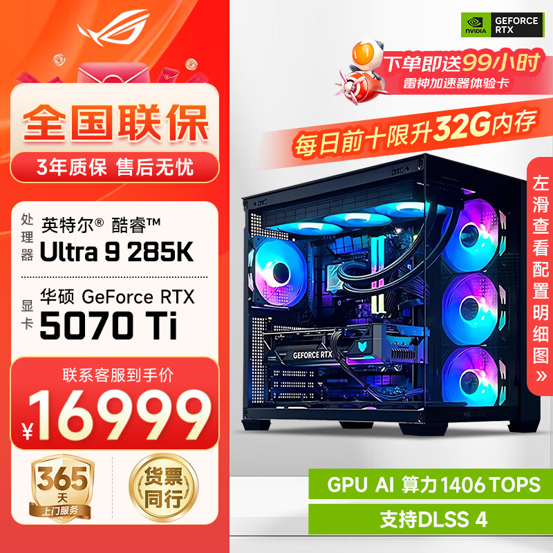 华硕ROG全家桶Ultra7 265KF/RTX5060Ti/5070Ti/5080显卡电竞游戏台式组装电脑AI主机整机DIY组装机 U9 285K+RTX5070Ti丨配置六