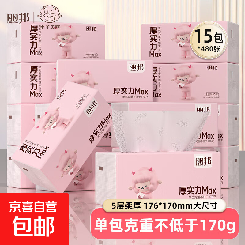 丽邦抽纸5层小羊贝丽系列柔厚大包纸巾整箱家庭实惠装 L码 5层 480张*15包