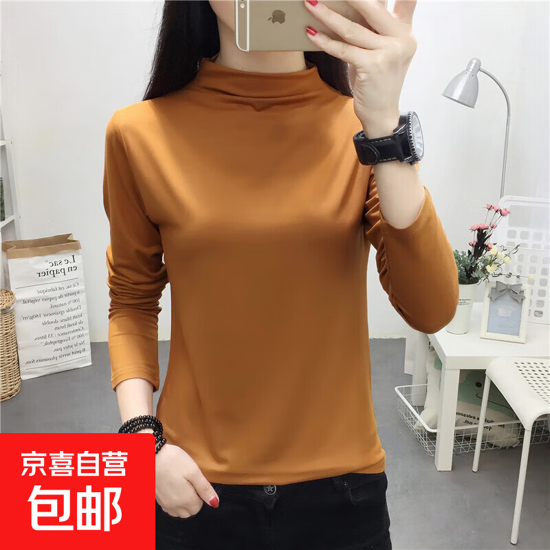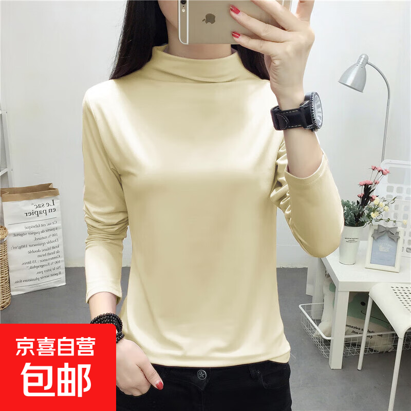 秋季小高领打底衫女内搭新款体恤长袖t恤打底百搭上衣半高领8003 杏色 M 参考80-100斤