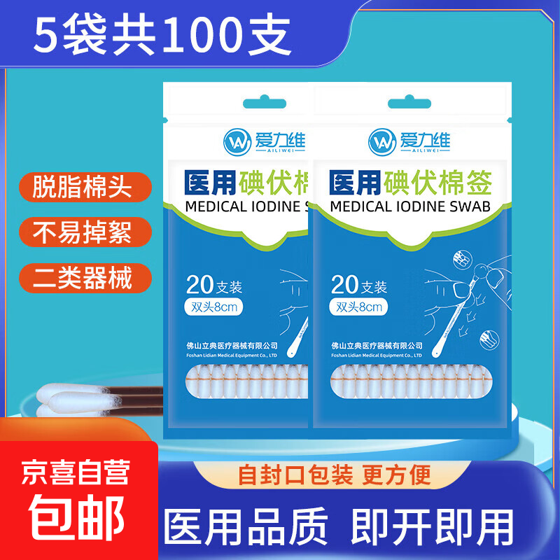 爱力维医用碘伏棉签酒精棉签新生婴儿肚脐消毒一次性宝宝家用便携 【5袋】碘伏棉签 到手100支