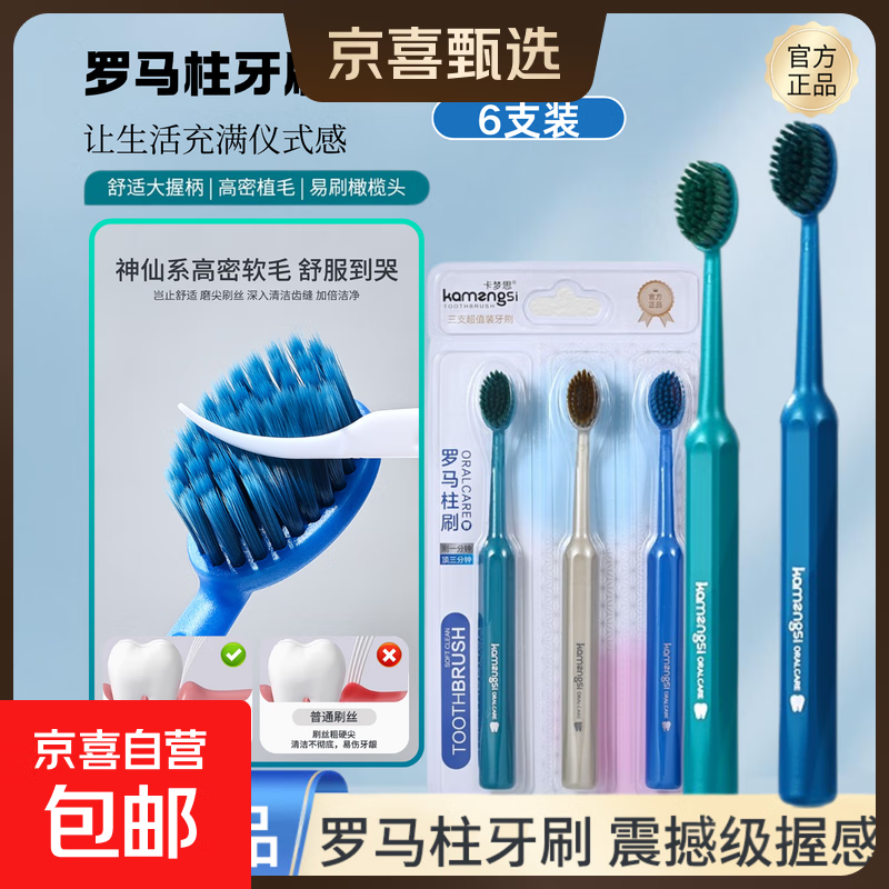 橄榄头软毛牙刷宽头罗马柱大头新款高档家用成人护龈情侣家庭装 中毛 6支 到手6支
