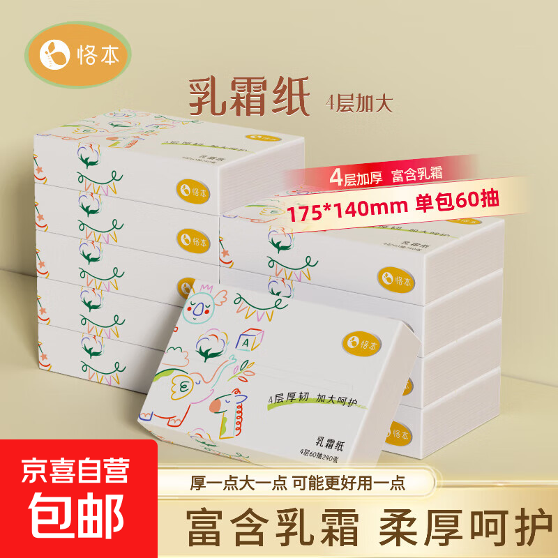 恪本 乳霜纸保湿纸婴儿云柔巾加厚加大柔纸巾抽纸新生婴儿专用纸 175*140mm 4层 60抽*10包
