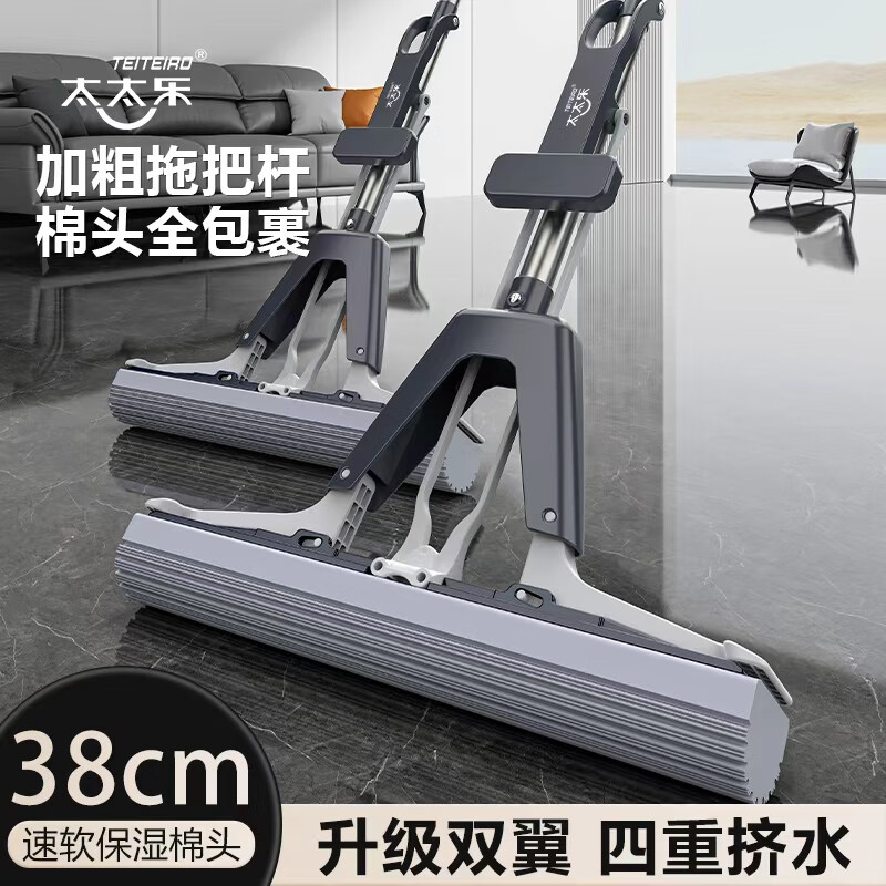 太太乐2025干湿两用胶棉拖把懒人吸水海绵拖家用一拖净免手洗 38cm速软*2头对折胶棉拖把