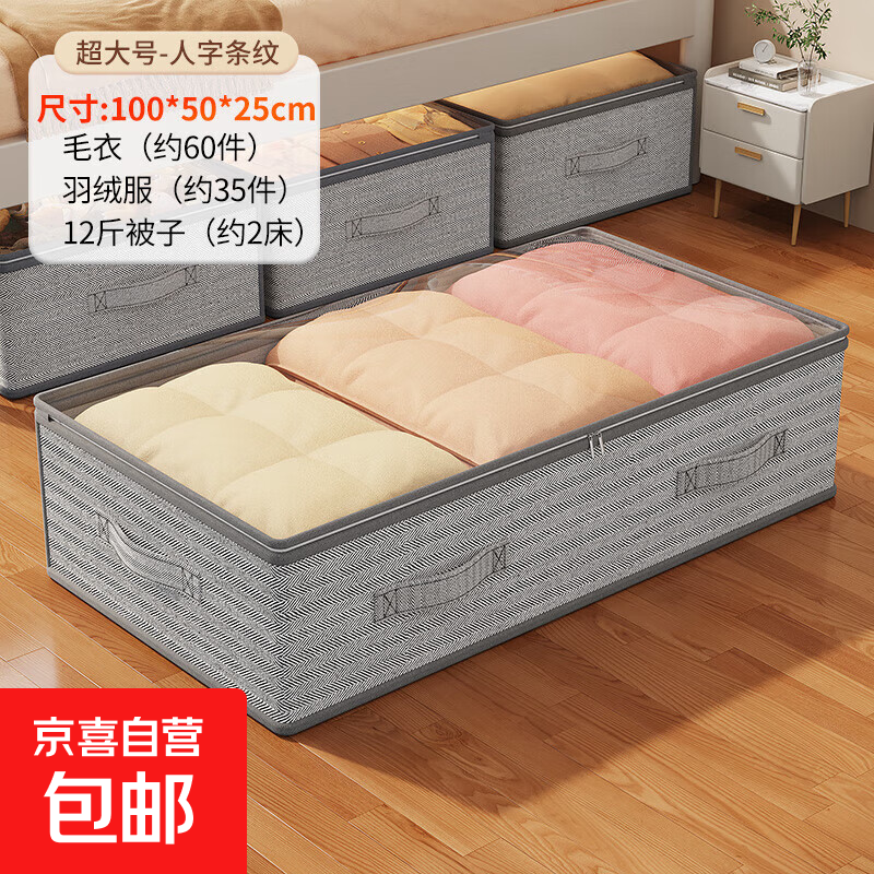 京东物流 床底布艺衣物收纳箱衣服收纳盒可折叠大号衣服整理箱 100*50*25cm 灰色人字纹 2个